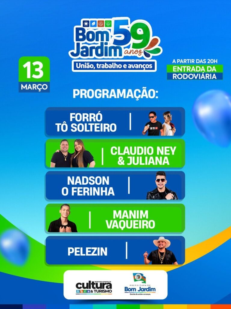 A Prefeitura de Bom Jardim, administrada pela prefeita Cristiane Varão, anunciou oficialmente a programação musical em comemoração aos 59 anos de emancipação política do município. O evento acontece nesta sexta-feira, dia 13 de março, na entrada da rodoviária, e promete ser uma noite histórica para a população.