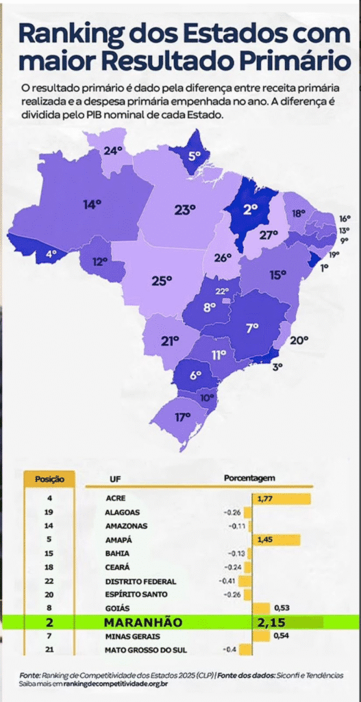 O Maranhão obteve um excelente resultado em gestão fiscal e alcançou o segundo lugar no indicador de Resultado Primário do Ranking de Competitividade dos Estados. Na classificação, o índice faz parte do pilar de Solidez Fiscal, no qual o Maranhão conquistou uma histórica segunda colocação, atrás apenas do Espírito Santo em todo o país. O […]