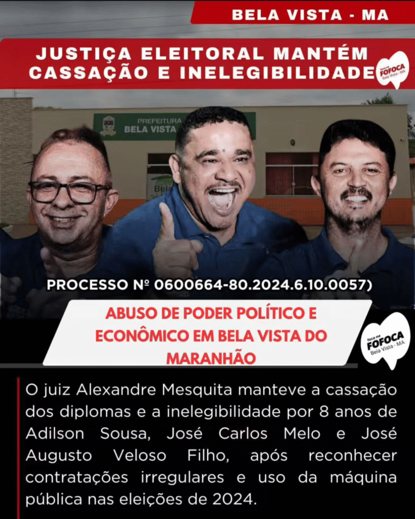 Decisão reforça combate ao abuso de poder político e econômico durante as eleições de 2024 A Justiça Eleitoral confirmou a cassação dos diplomas e a inelegibilidade, por oito anos, de Adilson Sousa, José Carlos Melo e José Augusto Veloso Filho, todos do município de Bela Vista do Maranhão. A decisão foi proferida pelo juiz Alexandre […]