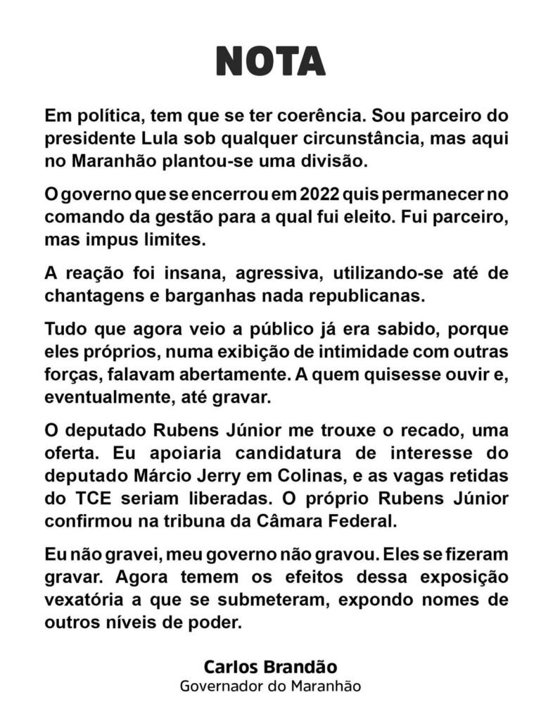 “O próprio Rubens Júnior confirmou na tribuna da Câmara Federal”, destacou Brandão, reforçando que não houve gravação feita por seu governo. “Eles se fizeram gravar. Agora temem os efeitos dessa exposição vexatória a que se submeteram, expondo nomes de outros níveis de poder”, completou.A declaração do governador expõe a insatisfação de antigos aliados que, desde o fim do governo anterior, tentam de diferentes formas atrapalhar o andamento da gestão. Incomodados com a perda de espaço e influência política, esses grupos têm adotado uma postura de resistência, utilizando-se de outros poderes da justiça para ampliar o clima de tensão e revelando um racha cada vez mais evidente no política maranhense.