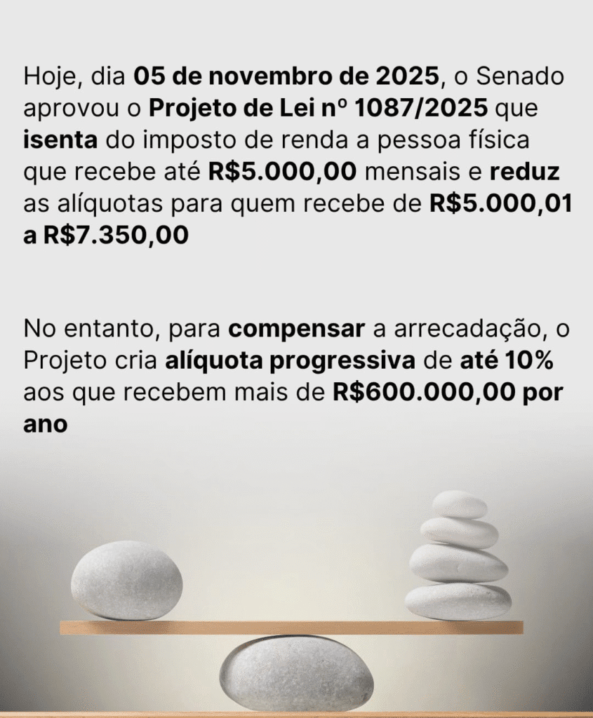 O Senado aprovou nesta quarta o projeto que amplia a isenção do Imposto de Renda para quem ganha até R$ 5 mil por mês. Trabalhadores com salário de até R$ 7.350 também serão beneficiados. Medida deverá ser sancionada pelo presidente Lula e entrar em vigor em 2026.