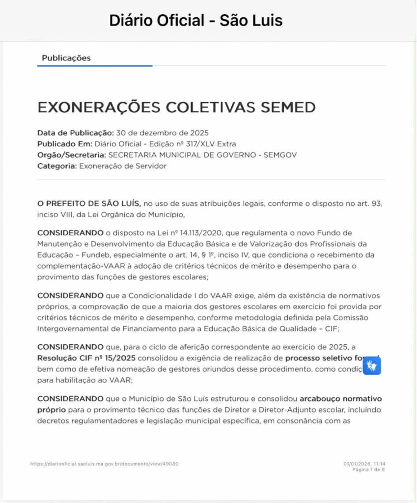 Mais de 100 diretores-adjuntos de escolas da rede municipal de ensino de São Luís foram exonerados de forma coletiva pelo prefeito Eduardo Braide (PSD). Os atos foram publicados no Diário Oficial do Município – Edição Extra nº 317/XLV, no dia 30 de dezembro de 2025, em pleno recesso escolar e às vésperas do início do ano letivo, impactando diretamente dezenas de unidades de ensino e mais de uma centena de famílias de educadores da capital.