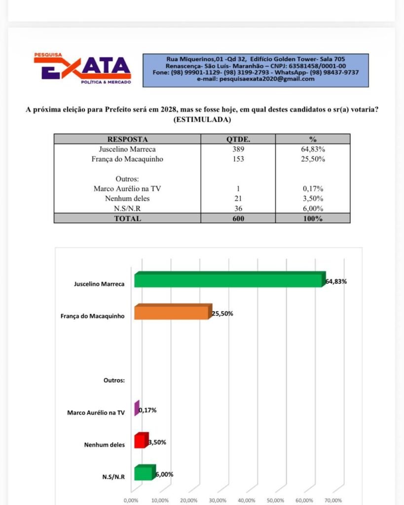 O prefeito de Santa Luzia (MA), Juscelino Marreca, atingiu 83% de aprovação popular, segundo levantamento divulgado pela Pesquisa Exata – Política & Mercado. O índice expressivo reflete a percepção positiva da população em relação à atual gestão municipal.